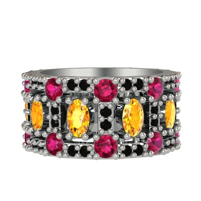 Sitrin, rodolit garnet ve siyah zirkon 18 ayar beyaz altın yüzük