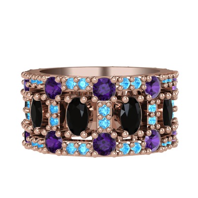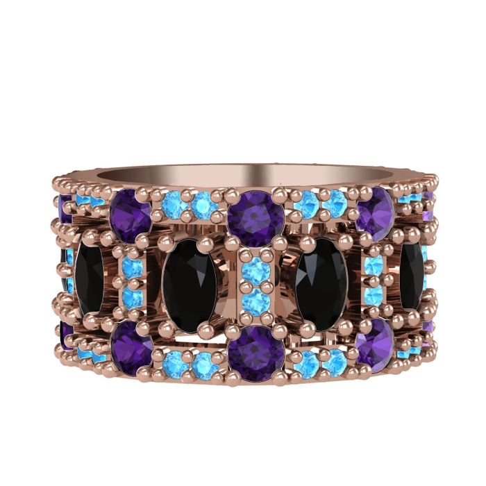 Siyah zirkon, ametist ve akuamarin 925 ayar rose altın kaplama gümüş yüzük