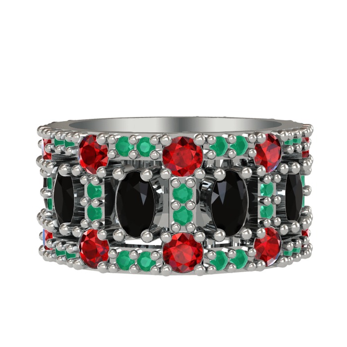 Siyah zirkon, garnet ve kök zümrüt 8 ayar beyaz altın yüzük