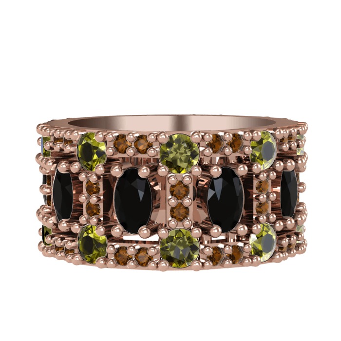 Siyah zirkon, peridot ve dumanlı kuvars 18 ayar rose altın yüzük