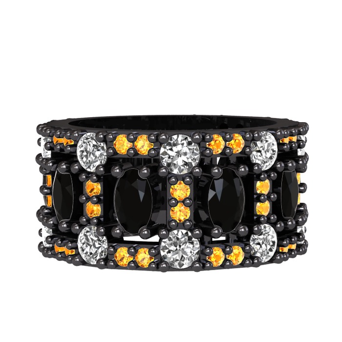 Siyah zirkon, pırlanta ve sitrin 925 ayar siyah rodyum kaplama gümüş yüzük (1.76 karat)