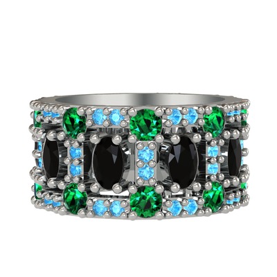 Siyah zirkon, yeşil kuvars ve akuamarin 18 ayar beyaz altın yüzük