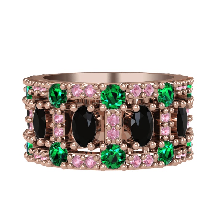 Siyah zirkon, yeşil kuvars ve pembe kuvars 14 ayar rose altın yüzük