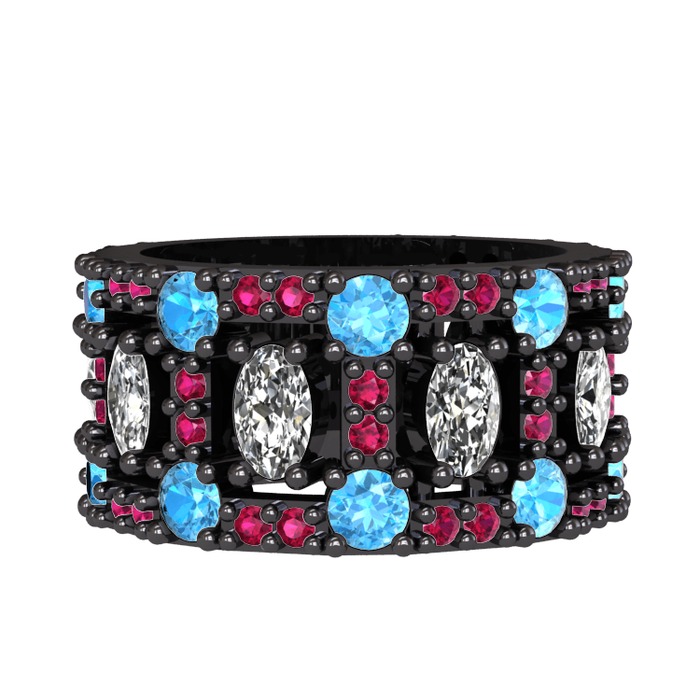 Swarovski, akuamarin ve rodolit garnet 925 ayar siyah rodyum kaplama gümüş yüzük
