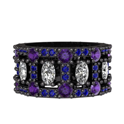 Swarovski, ametist ve lab safir 925 ayar siyah rodyum kaplama gümüş yüzük