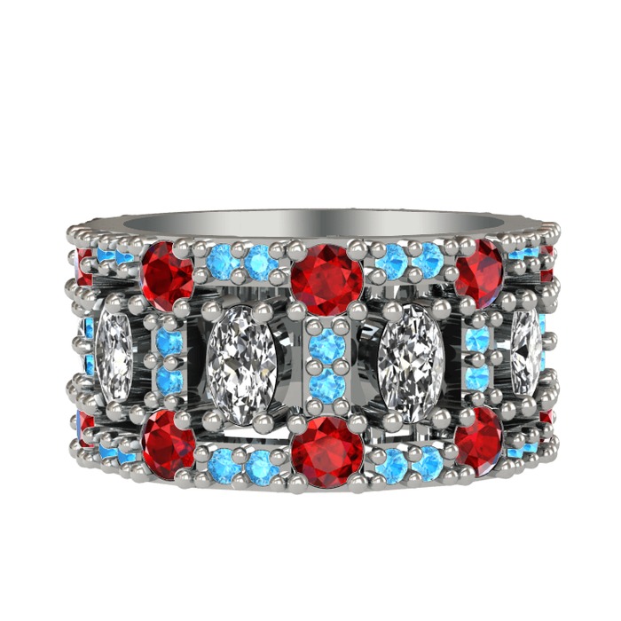 Swarovski, garnet ve akuamarin 8 ayar beyaz altın yüzük