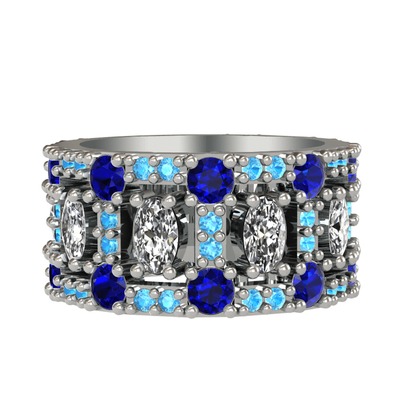 Swarovski, lab safir ve akuamarin 8 ayar beyaz altın yüzük