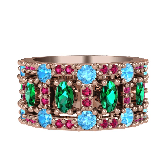 Yeşil kuvars, akuamarin ve rodolit garnet 14 ayar rose altın yüzük