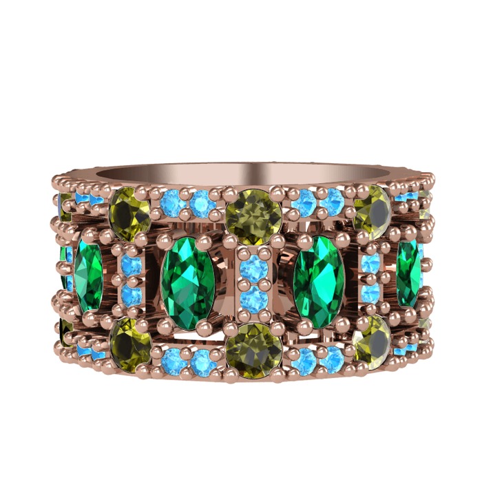 Yeşil kuvars, peridot ve akuamarin 925 ayar rose altın kaplama gümüş yüzük