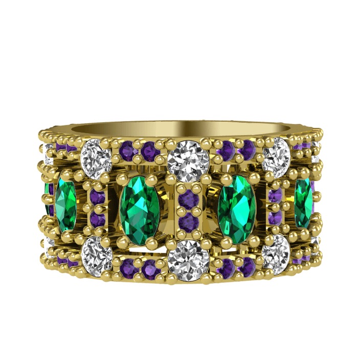 Yeşil kuvars, pırlanta ve ametist 925 ayar altın kaplama gümüş yüzük (1.76 karat)