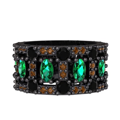 Yeşil kuvars, siyah zirkon ve dumanlı kuvars 925 ayar siyah rodyum kaplama gümüş yüzük